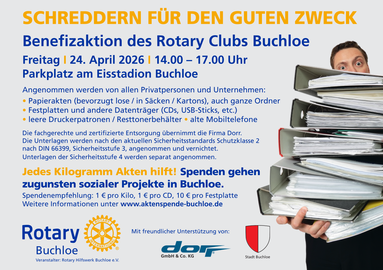 | Auch in diesem Jahr können Sie Ihre sensiblen Dokumente sowie nicht mehr benötigte Datenträger sicher bei der Aktenschredder-Aktion des Rotary Clubs Buchloe für den guten Zweck loswerden. |